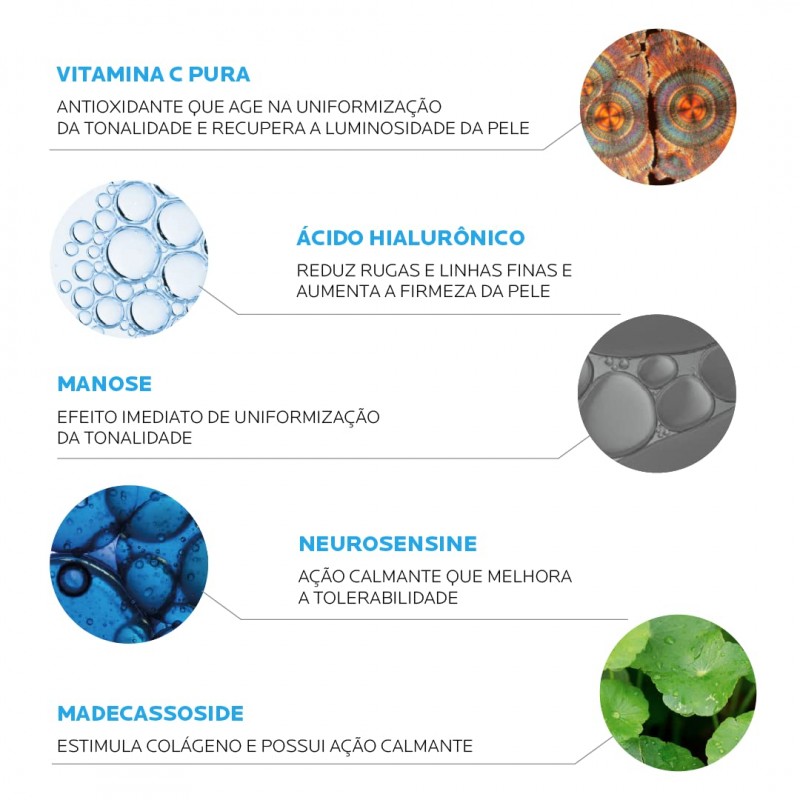 Su fórmula combina Vitamina C pura (ácido L-ascórbico), un potente antioxidante reconocido por su eficacia iluminadora y antiedad, con Ácido Hialurónico fragmentado para hidratar y rellenar la piel desde el interior. Además, contiene Neurosensina, un activo calmante que ayuda a reducir la sensibilidad y las molestias cutáneas.