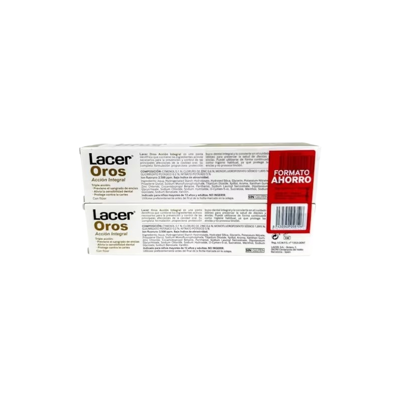 Lacer Oros Pasta Dental Duplo en formato de 2 x 125 ml ofrece una limpieza dental eficaz y protección avanzada contra la caries y los problemas de encías. Su fórmula con flúor y agentes antimicrobianos asegura una salud bucal óptima, reduciendo la placa bacteriana y manteniendo el aliento fresco.