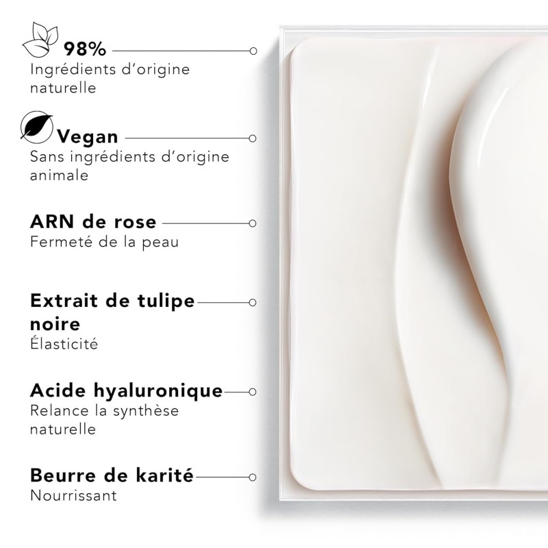 Su textura gel-crema es fresca y no grasa, ideal para pieles normales a mixtas, proporcionando un efecto lifting inmediato y progresivo. Actúa sobre las tres estructuras clave de la piel: colágeno, elastina y ácido hialurónico, restaurando el volumen facial y redefiniendo los contornos.