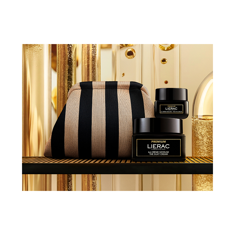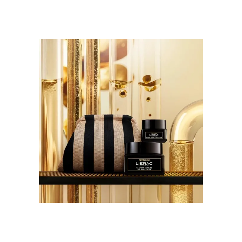 Pack antiedad global Lierac Premium que corrige arrugas, reafirma, ilumina y revitaliza la piel, incluyendo neceser de regalo, crema facial textura sedosa y contorno de ojos.