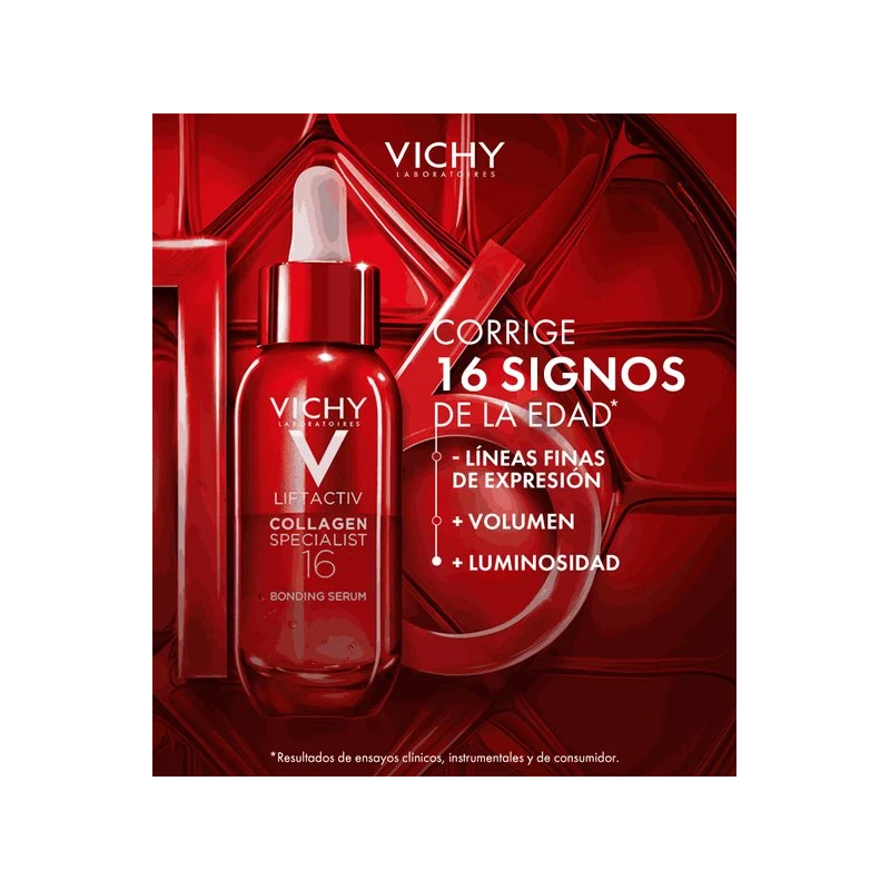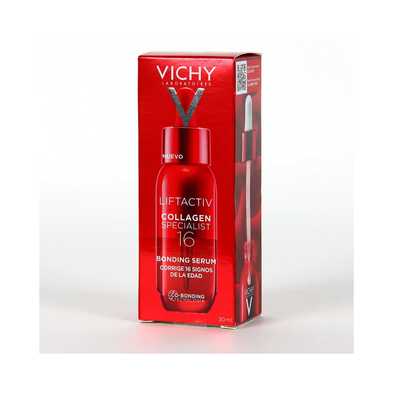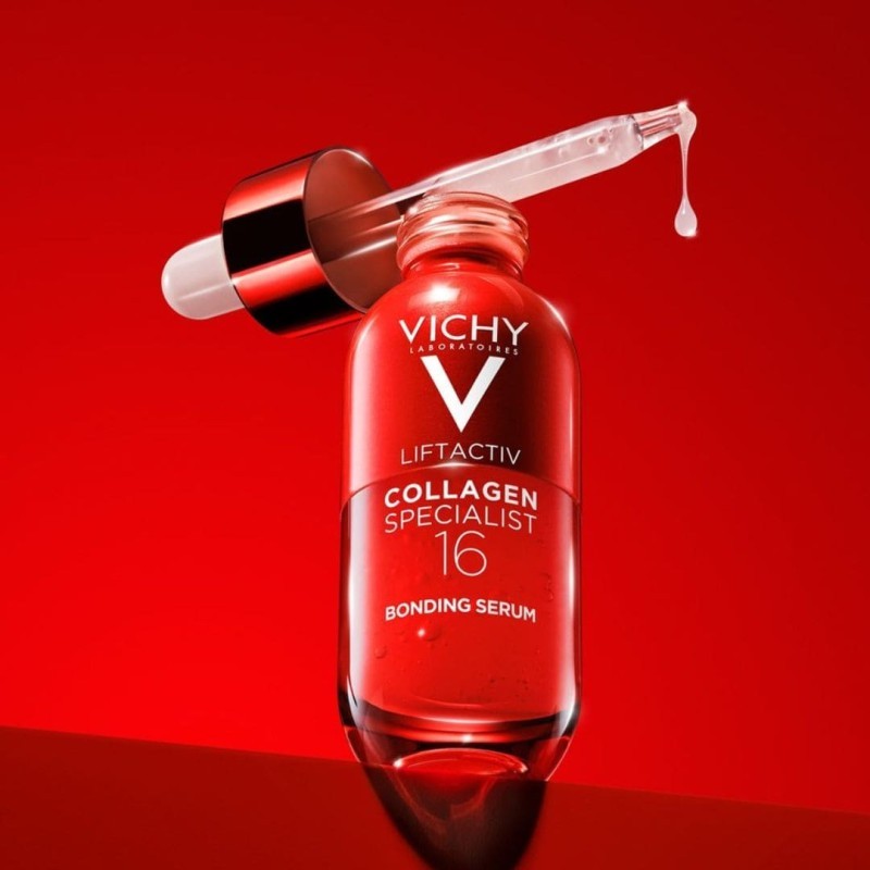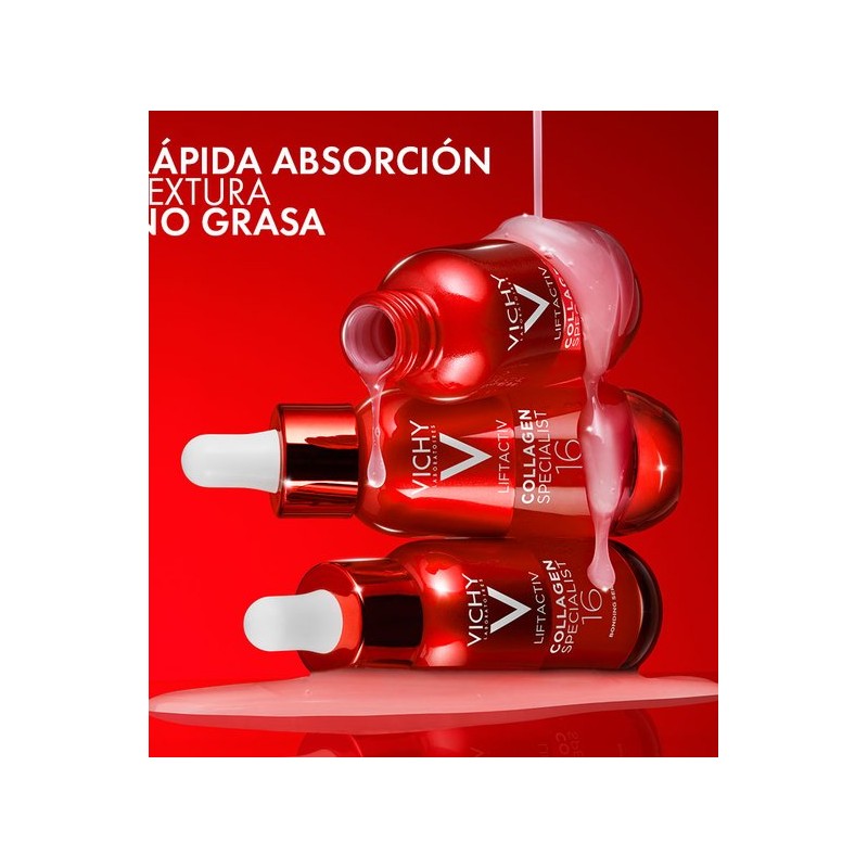Vichy Liftactiv Collagen Specialist 16 Serum 30ml es un tratamiento concentrado diseñado para estimular la producción de colágeno y mejorar la calidad de la piel. Su fórmula combina un 16% de activos dermatológicos como péptidos reafirmantes, vitamina Cg y bio-péptidos, que trabajan en sinergia para reducir arrugas, mejorar la elasticidad y aportar luminosidad al rostro.