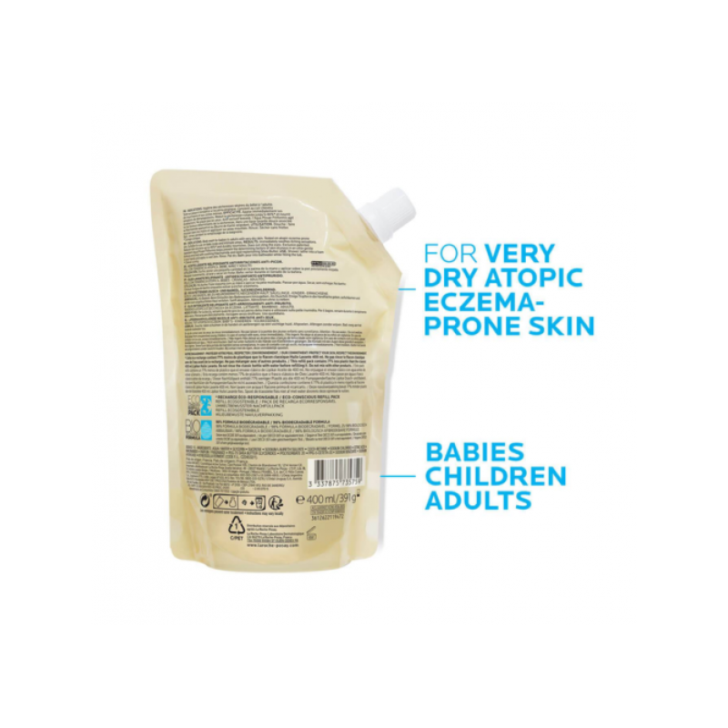 Aceite de ducha relipidizante en formato eco recarga que limpia suavemente, nutre intensamente y protege la piel seca y sensible desde la ducha diaria.