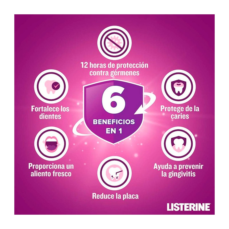 El enjuague bucal LISTERINE Cuidado Total es una solución completa para una higiene bucal óptima. Con su fórmula avanzada, este enjuague proporciona una limpieza profunda que llega a donde el cepillado y el uso del hilo dental no pueden alcanzar. Elimina hasta un 99% de los gérmenes que causan la placa bacteriana, el sarro y la gingivitis, ayudando a mantener las encías sanas y los dientes fuertes.