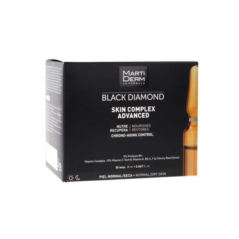Ampollas Martiderm Black Diamond Skin Complex Advance incluye 30 ampollas de la versión renovada de Skin Complex+. Fórmula más completa para tratar el cronoenvejecimiento y/o la piel desvitalizada.