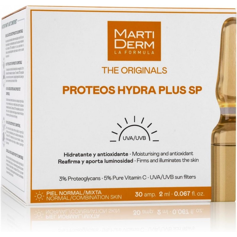 MartiDerm Proteos Hydra Plus SP 30 ampollas de 2 ml, de MartiDerm, es un tratamiento intensivo formulado para hidratar en profundidad, aportar luminosidad y proteger la piel frente a los daños solares.