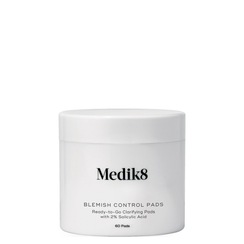 Medik8 Blemish Control Pads son discos de tratamiento exfoliantes, presentados en un envase de 60 unidades, formulados con ácido salicílico para combatir las imperfecciones, controlar el exceso de sebo y promover una piel más clara y uniforme.