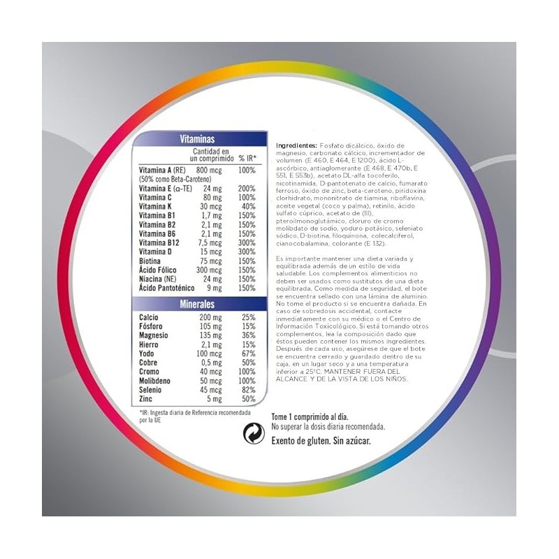 En su fórmula contiene vitaminas (A, E, C, K, B1, B2, B6, B12, D, Biotina, Ácido Fólico, Niacina y Ácido Pantoténico) y minerales (Calcio, Fósforo, Magnesio, Hierro, Yodo, Cobre, Cromo, Molibdeno, Selenio y Zinc). Sin gluten.