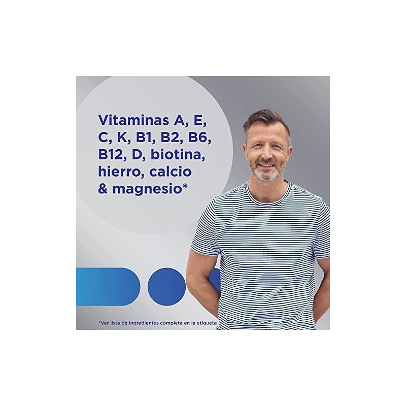 Complemento alimenticio con vitaminas y minerales. Su principal función es ayudar a satisfacer las necesidades nutricionales específicas de los hombres a partir de los 50 años, además, contribuye al metabolismo energético normal, disminuyendo así el cansancio y la fatiga. También contribuye al funcionamiento normal del sistema inmunitario, al mantenimiento de la visión en condiciones normales y al rendimiento intelectual normal.