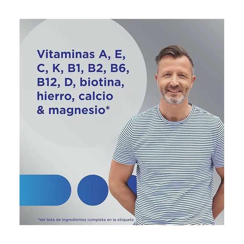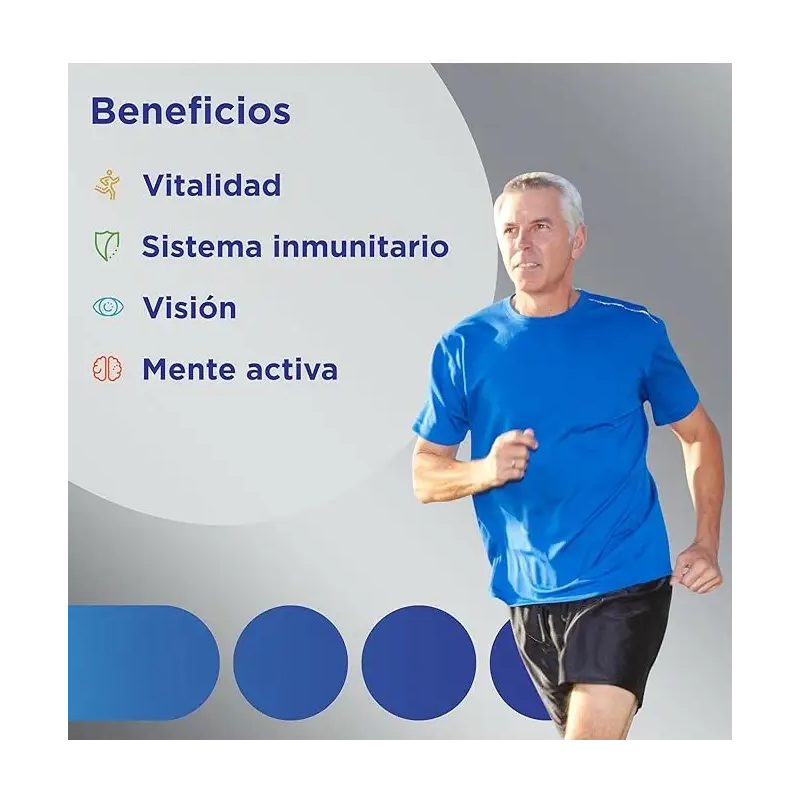 Su fórmula incluye un alto contenido en vitaminas del grupo B, que ayudan al metabolismo energético, vitamina D y magnesio para el mantenimiento de la masa muscular, y antioxidantes como el zinc, selenio y vitamina C, que apoyan las defensas del organismo. Además, incorpora nutrientes que favorecen la función cognitiva y visual, esenciales en esta etapa de la vida.