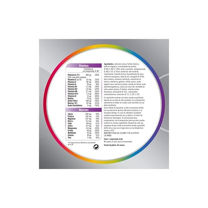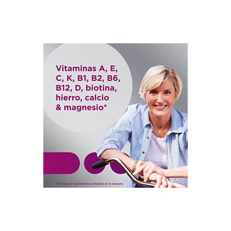 Complemento alimenticio con vitaminas y minerales. Su principal función es ayudar a satisfacer las necesidades nutricionales específicas de las mujeres a partir de los 50 años. Además, contribuyen al metabolismo energético normal disminuyendo así el cansancio y la fatiga. También, contribuyen al funcionamiento normal del sistema inmunitario, al mantenimiento de los huesos en condiciones normales y a hacer frente a los cambios en las necesidades nutricionales tras la menopausia.