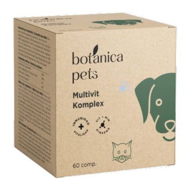 Multivit Komplex de BotánicaPets es un suplemento nutricional formulado para aportar un refuerzo diario de vitaminas y minerales esenciales en perros y gatos. Su composición incluye vitaminas A, C, D, E y del grupo B, así como minerales como zinc, hierro y selenio, fundamentales para mantener el buen funcionamiento del sistema inmunológico, la piel, el pelaje, los huesos y el metabolismo. Ideal durante periodos de crecimiento, convalecencia, estrés, cambio de estación o simplemente como apoyo diario para mejorar la energía y el bienestar. Su formato en comprimidos masticables de alta palatabilidad facilita la administración. Envase con 60 unidades.