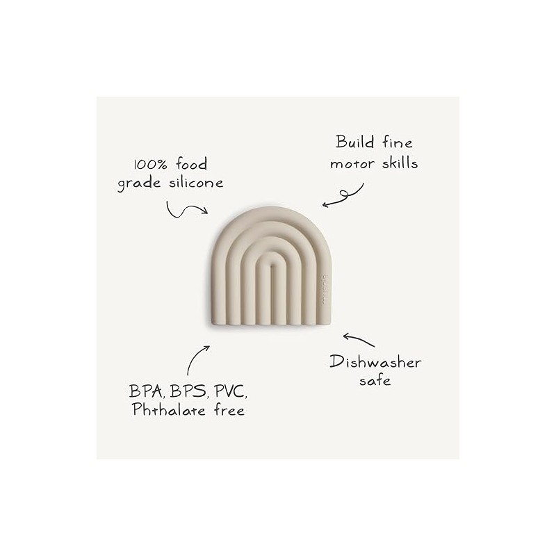 El Mushie Mordedor Silicona Rainbow Verde está diseñado para calmar las encías del bebé durante la dentición de manera segura y divertida. Fabricado con silicona 100% libre de BPA, ftalatos y PVC, es suave, duradero y fácil de limpiar. Su diseño ergonómico y colorido en tonos verdes facilita que el bebé lo agarre cómodamente mientras juega y se alivia.