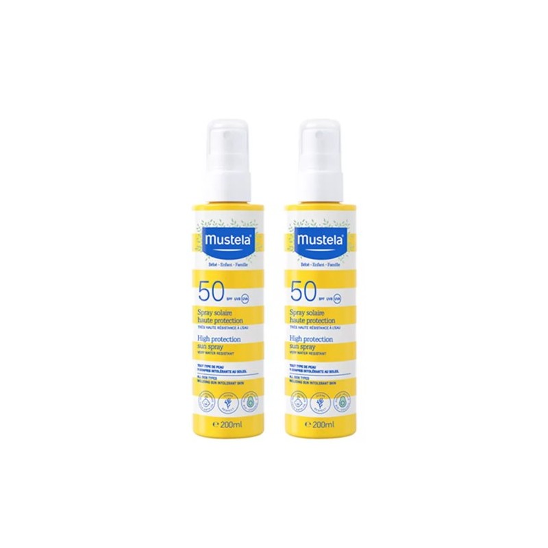 Pack duplo del Mustela Spray solar SPF50 de alta protección con aguacate BIO que protege la piel de toda la familia desde el nacimiento*, incluso pieles atópicas, bebés, niños y embarazadas. Resistente al agua y la arena.