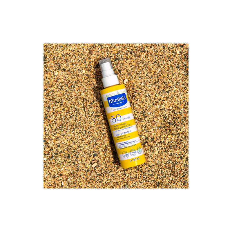 Mustela Spray Solar Muy Alta Protección SPF50+ 200 ml es un fotoprotector especialmente formulado para la delicada piel de los más pequeños, desde recién nacidos (salvo prematuros), garantizando una muy alta protección frente a los rayos solares UVA y UVB.