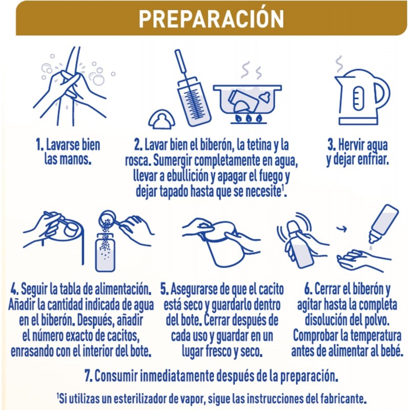 Desde Sanafarmacia te recomendamos lavar bien manos y utensilios antes de preparar el biberón. Hervir agua y dejar enfriar hasta 40 °C. Añadir las medidas indicadas según la tabla del envase. Agitar bien hasta disolver el polvo. Administrar inmediatamente y descartar el sobrante.