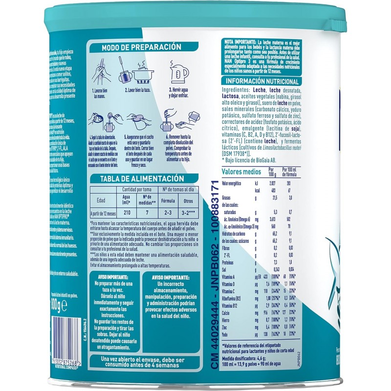 NAN OPTIPRO 3 Leche en Polvo 800 g es una leche de crecimiento especialmente formulada para niños a partir de 1 año, como parte de una alimentación variada y equilibrada. Su composición está diseñada para cubrir las necesidades nutricionales específicas de esta etapa, en la que el niño experimenta un rápido desarrollo físico, cognitivo e inmunitario.