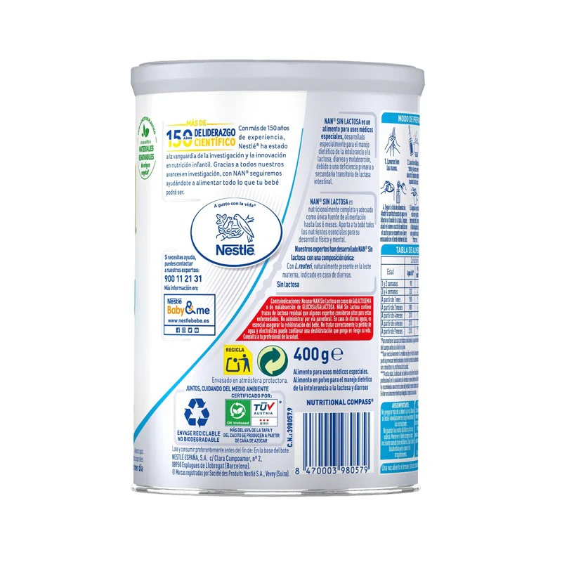 NAN Expert Pro Sin Lactosa 400 g, anteriormente conocida como AL-110, es una fórmula infantil especialmente diseñada para lactantes desde el nacimiento que presentan intolerancia a la lactosa, ya sea de forma transitoria o persistente. Está indicada cuando la lactancia materna no es posible o debe interrumpirse temporalmente, siempre bajo recomendación de un profesional sanitario.