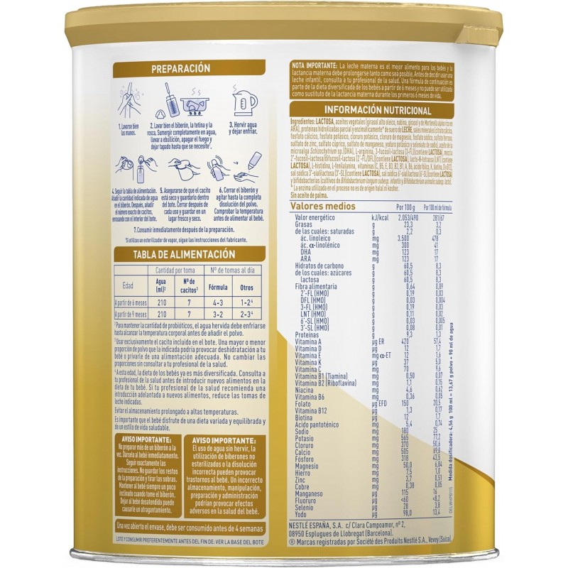 Su fórmula incorpora una combinación exclusiva de oligosacáridos HMO (2’-FL y LNnT), componentes estructurales presentes en la leche materna que contribuyen al desarrollo de una microbiota intestinal saludable y refuerzan las defensas naturales. Incluye además postbióticos, que trabajan en conjunto para mejorar la respuesta inmunitaria y favorecer una digestión equilibrada.