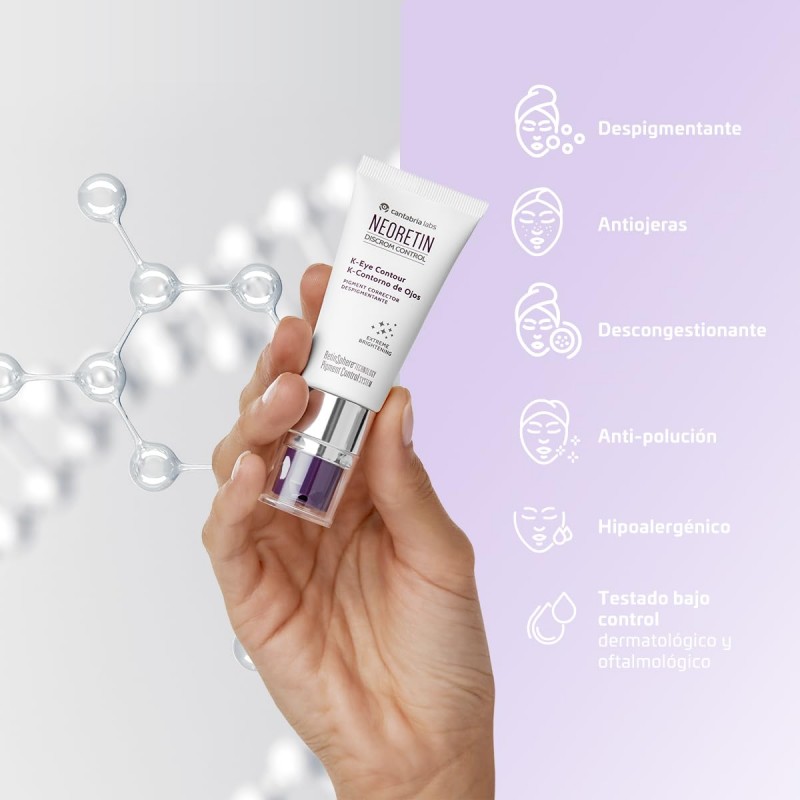 Neoretin Discrom Control K-Eyes es un contorno de ojos de tratamiento intensivo con acción antiojeras despigmentante, descongestionante y antipolución. Formulado a base de vitamina K-Óxido y ácido tranexámico entre otros.