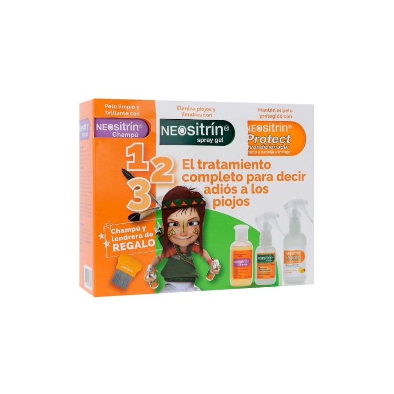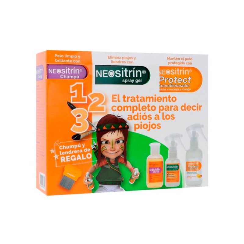 Neositrin Pack Antipiojos es un kit pensado para ofrecer una rutina capilar completa frente a los piojos, integrando tres productos en un solo pack. Incluye un champú (regalo), un spray-gel eliminador y un acondicionador protector, diseñados para utilizarse de forma combinada y ordenada. Además como 2º regalo incluye una lendrera de puas metálicas para realizar el tratamiento lo más eficazmente posible y no tener que repetir.