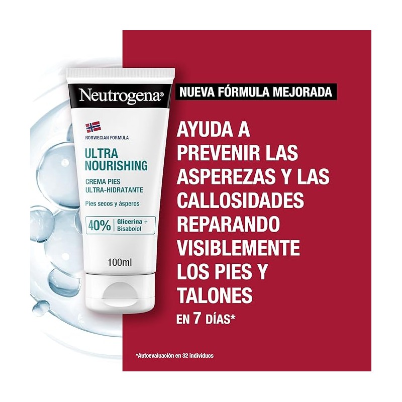 Más informaciónNeutrogena Crema Ultrahidratante para Pies, con su exclusiva Fórmula Noruega, está clínicamente probada para hidratar en profundidad hasta 24 horas, reparando la barrera cutánea y aliviando desde la primera aplicación.