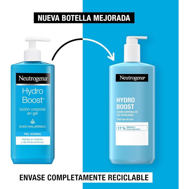 Más informaciónNeutrogena Hydro Boost Loción Corporal Hidratante Gel está formulada con Ácido Hialurónico, conocido por su capacidad de retener el agua en la piel. Su innovadora textura en gel se absorbe de forma inmediata, proporcionando una hidratación intensa y continua sin sensación grasa. Refresca la piel desde la primera aplicación y ayuda a mantenerla visiblemente más suave, luminosa y flexible, incluso en pieles secas o deshidratadas.