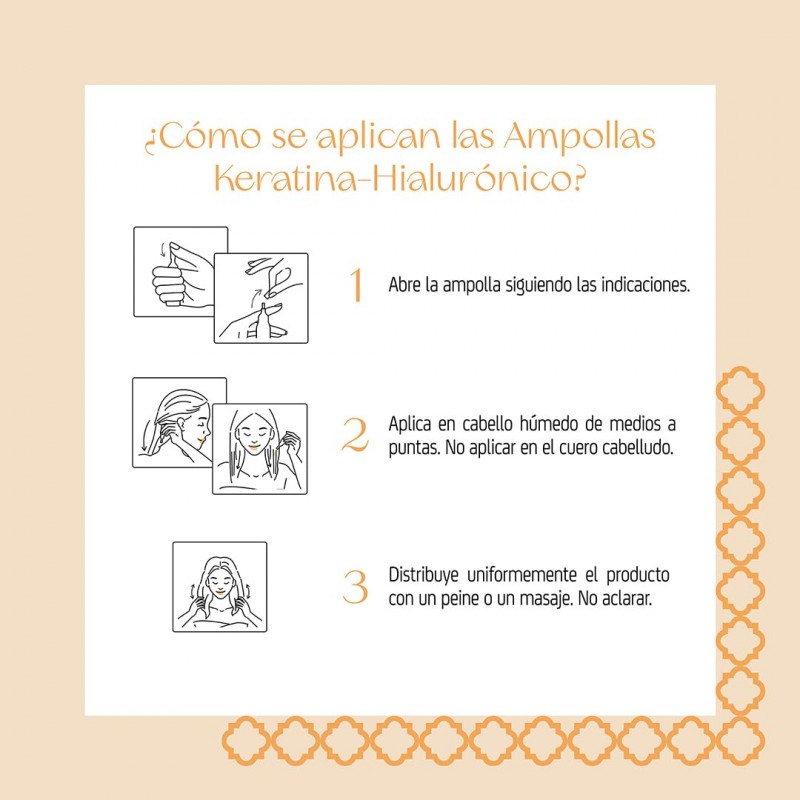 Ampolla capilar concentrada con queratina pura y ácido hialurónico que repara, hidrata y fortalece el cabello, aportando suavidad, brillo y resistencia desde la primera aplicación.