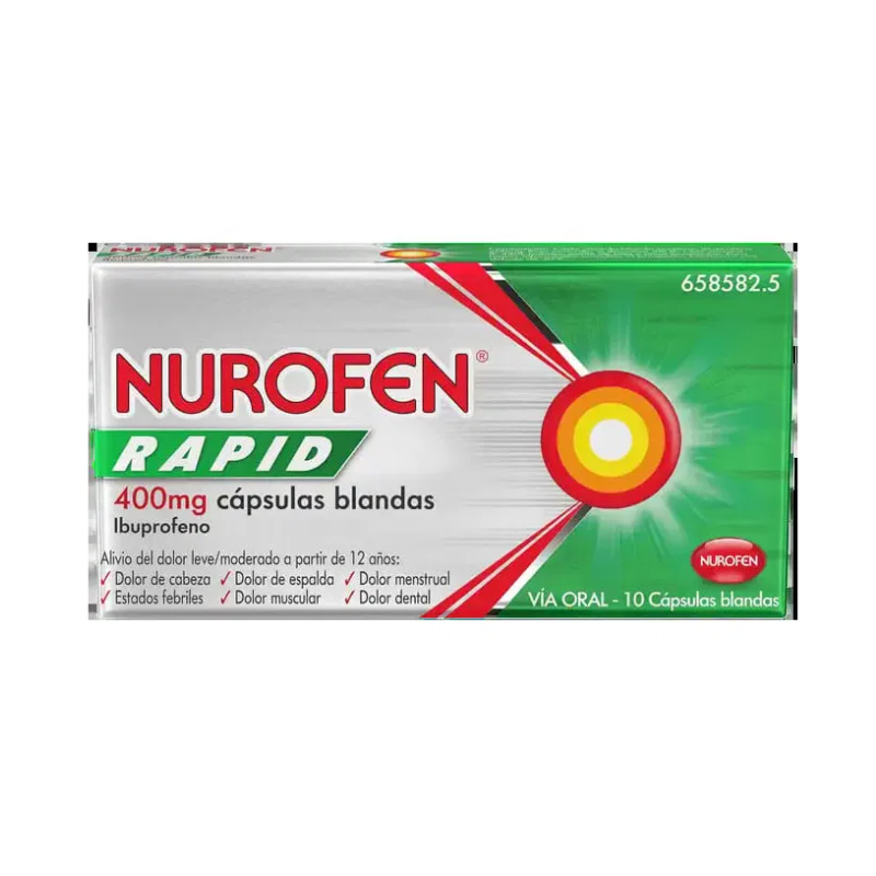 Nurofen Rapid 400 mg 10 cápsulas blandas, analgésico y antiinflamatorio de acción rápida para aliviar dolor y fiebre.