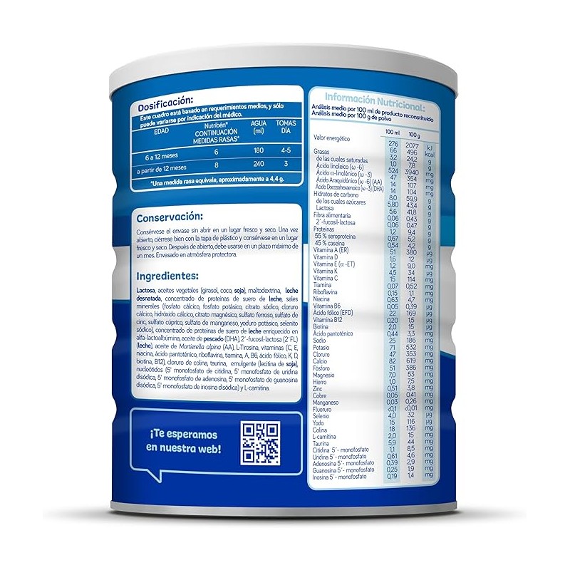 Su composición está adaptada para esta etapa clave del desarrollo, aportando una combinación equilibrada de nutrientes esenciales que contribuyen al crecimiento, desarrollo cognitivo y fortalecimiento del sistema inmunitario. Esta leche de continuación complementa la alimentación del bebé cuando la lactancia materna no es posible o resulta insuficiente.