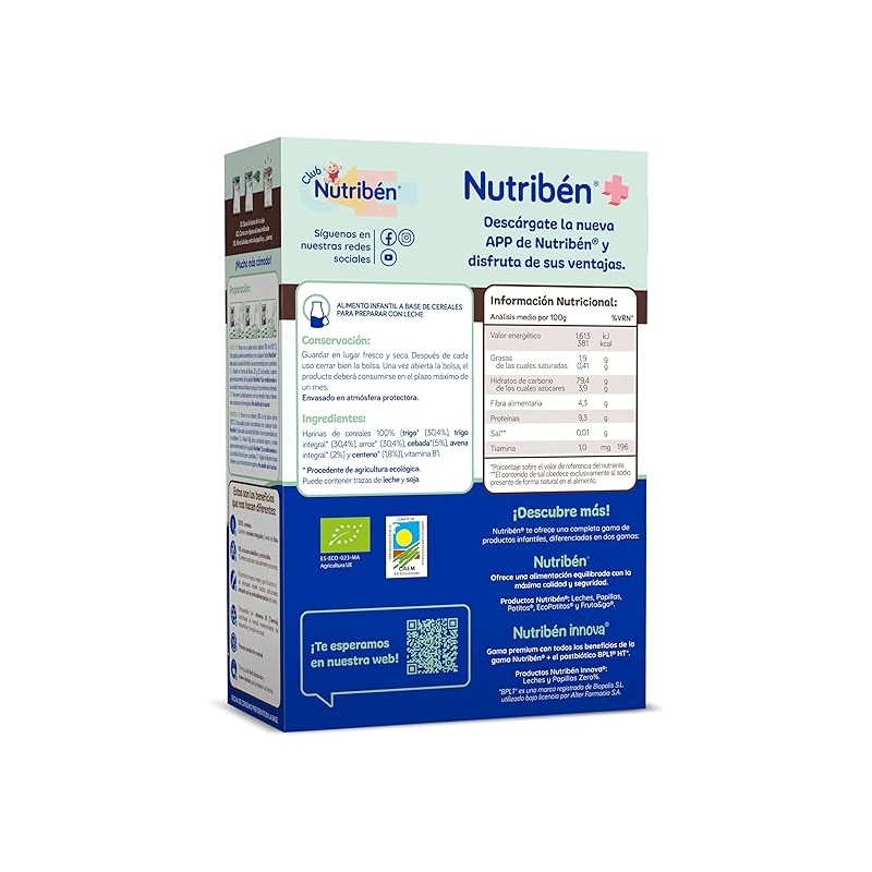 Nutribén Eco Multicereales es una papilla ecológica para bebés a partir de 6 meses, elaborada con una mezcla de cereales cuidadosamente seleccionados para una alimentación equilibrada.