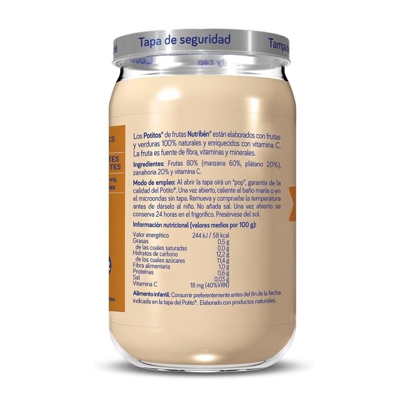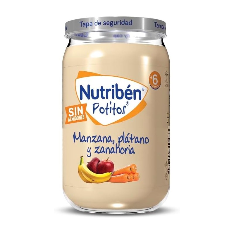 Nutribén Potito Manzana, Plátano y Zanahoria 235 g, de Nutribén, es un alimento infantil elaborado con ingredientes seleccionados que combinan frutas y verduras para aportar una mezcla equilibrada de sabor y nutrientes. Su receta une el dulzor natural de la manzana y el plátano con el aporte nutritivo de la zanahoria, ofreciendo una opción completa y sabrosa para la alimentación del bebé.