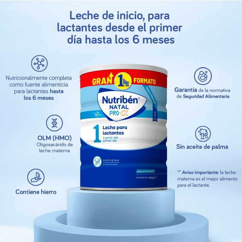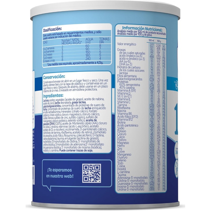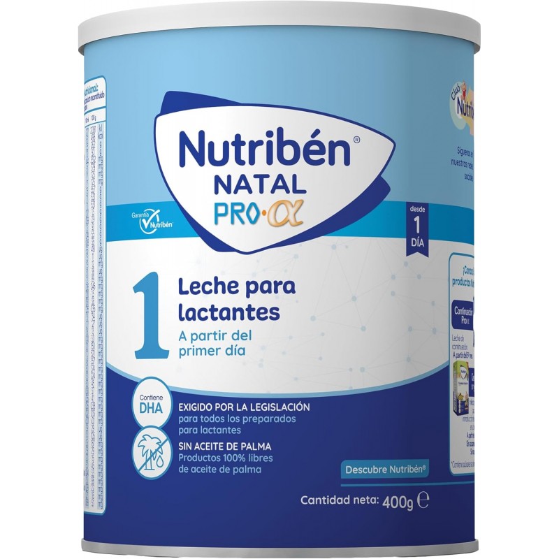 Nutribén Natal Pro-Alfa 1 Leche Lactantes 800 g, de Nutribén, es una fórmula infantil diseñada para cubrir las necesidades nutricionales de los bebés desde el primer día de vida, cuando la lactancia materna no es posible o resulta insuficiente.