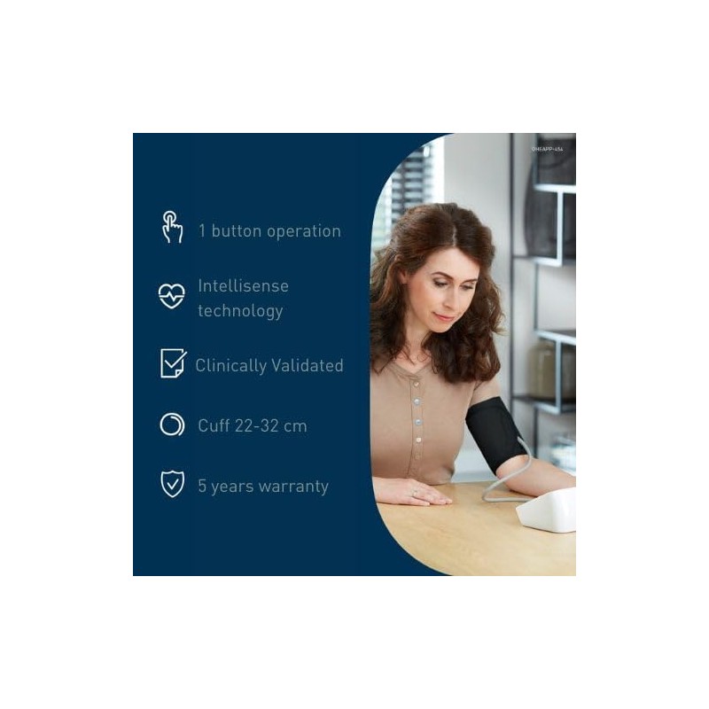 Cuenta con un cómodo manguito de brazo de tamaño universal (22–42 cm), perfecto para la mayoría de usuarios. Su pantalla grande y de alto contraste permite visualizar claramente la presión sistólica, diastólica y el pulso. Además, detecta latidos irregulares e incorpora una guía de ajuste del manguito para asegurar una medición correcta.