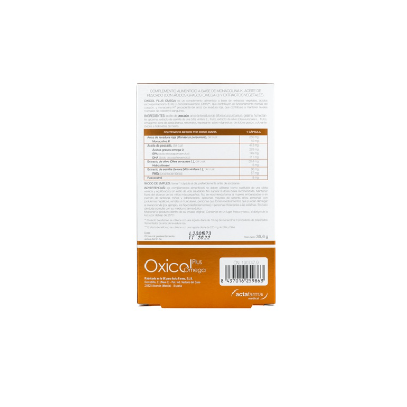 Oxicol Plus Omega en su presentación de 30 cápsulas blandas es un complemento alimenticio que combina extracto de arroz de levadura roja y ácidos grasos omega-3.