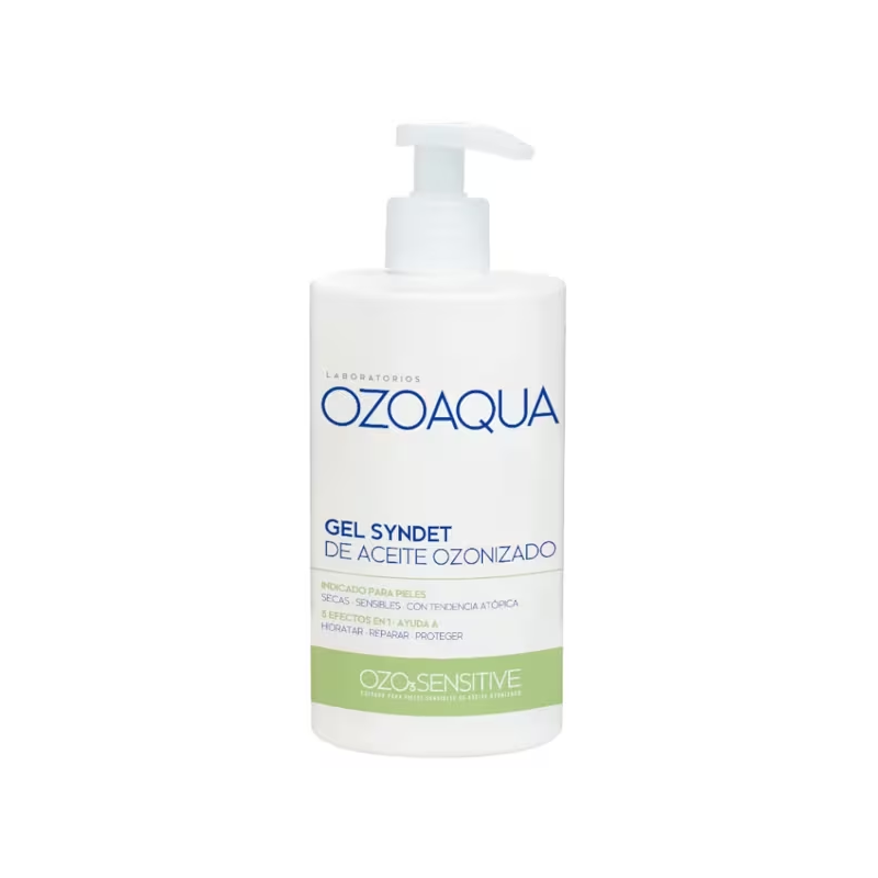 El Ozoaqua Gel Syndet de Aceite Ozonizado 500 ml es un gel de higiene diaria formulado especialmente para el cuidado de pieles secas, sensibles o con tendencia atópica. Su fórmula tipo syndet (sin jabón tradicional) respeta la barrera cutánea, ayudando a mantener el equilibrio natural de la piel.