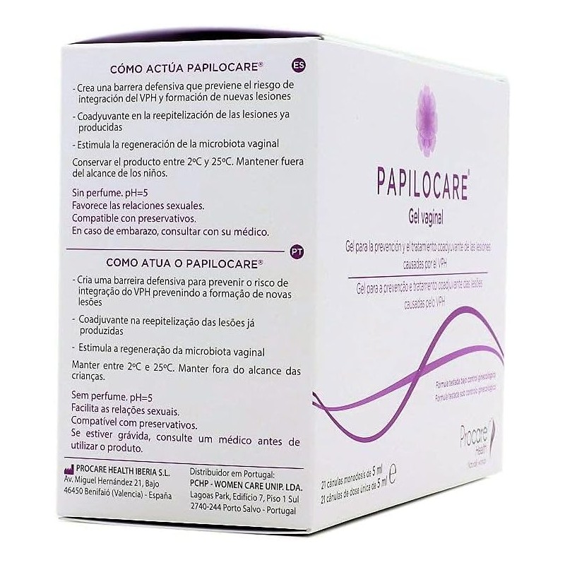 Papilocare Gel Vaginal 21 Cánulas Monodosis 5 ml es el primer tratamiento ginecológico diseñado para prevenir y reparar las lesiones cervicales causadas por el VPH (virus del papiloma humano). Su fórmula innovadora crea una barrera protectora bioadhesiva que favorece la regeneración epitelial y restaura el equilibrio natural de la mucosa vaginal, ayudando a reducir el riesgo de progresión de lesiones.
