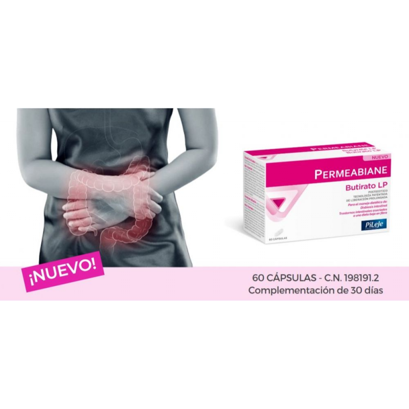 Permebiane Butirato LP es un postbiótico con tecnología patentada de liberación prolongada, para el manejo dietético de la disbiosis intestinal y de los trastornos intestinales asociados a una dieta baja en fibra.