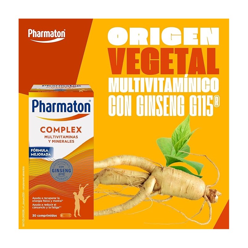 Pharmaton Complex en su presentación de 30 comprimidos es un suplemento multivitamínico especialmente formulado para ayudar a combatir el cansancio y la fatiga, proporcionando energía y apoyo nutricional para el día a día.