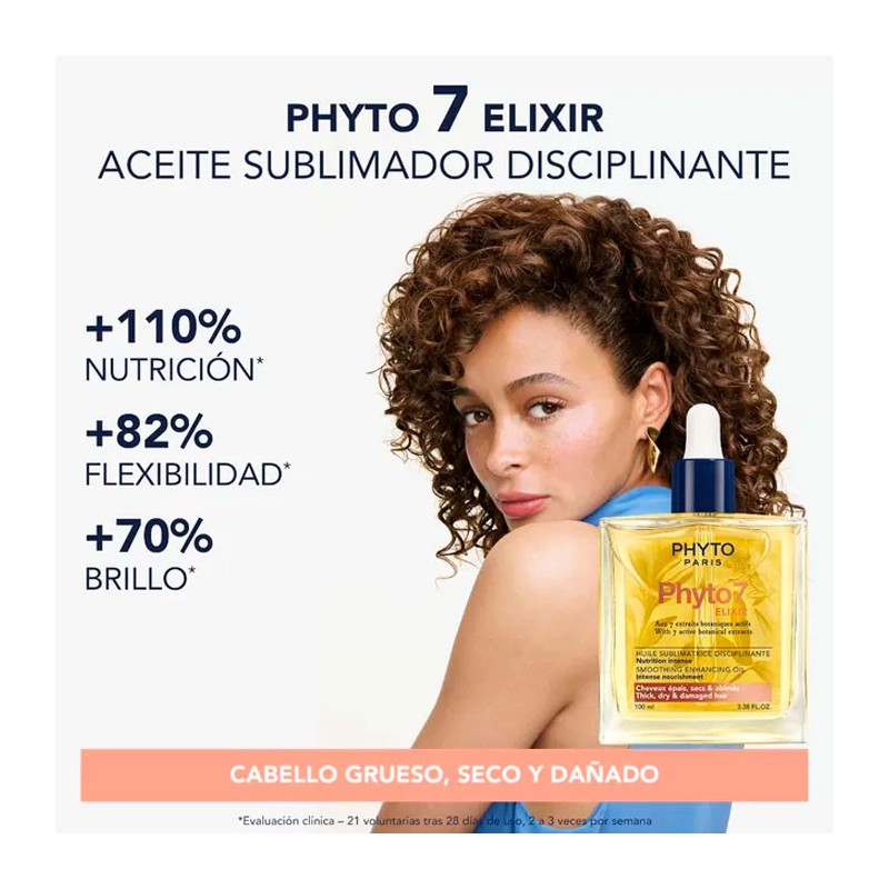 Phyto 7 Elixir Cabello Grueso Seco y Dañado 100 ml es un tratamiento capilar nutritivo y reparador especialmente diseñado para cubrir las necesidades del cabello grueso, seco y sensibilizado. Su fórmula rica en aceites vegetales naturales proporciona una hidratación profunda, reestructura la fibra capilar y devuelve elasticidad y vitalidad al cabello. Gracias a su textura envolvente, protege frente a las agresiones externas y facilita el peinado, dejando el cabello más flexible, brillante y saludable. Ideal para cabellos castigados por el uso de herramientas de calor, tintes o factores ambientales.