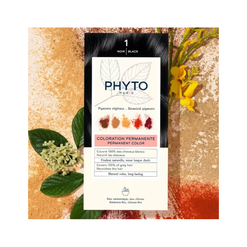 Phyto Color Tinte 1.0 Negro proporciona un color intenso y luminoso, con un resultado natural gracias a su fórmula única basada en pigmentos de origen vegetal y aceites nutritivos que cuidan el cabello desde la raíz hasta las puntas.