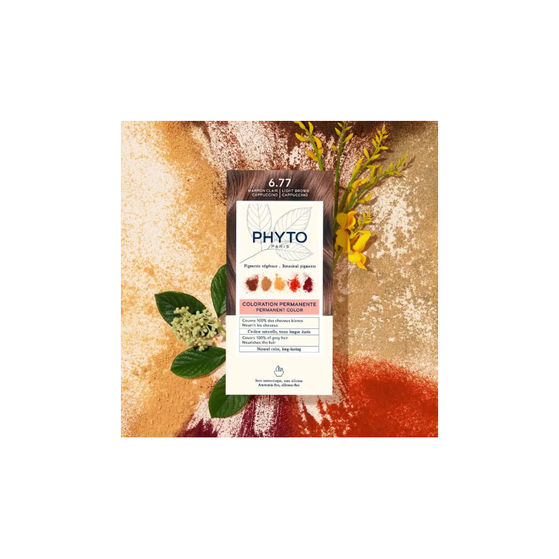 Phyto Color Tinte 6.77 Marrón Claro Capuchino combina intensidad y naturalidad en un tono marrón claro con matices cálidos y reflejos luminosos. Su fórmula única, enriquecida con pigmentos de origen vegetal y aceites nutritivos (jojoba, monoï y macadamia), protege y embellece el cabello durante todo el proceso de coloración.