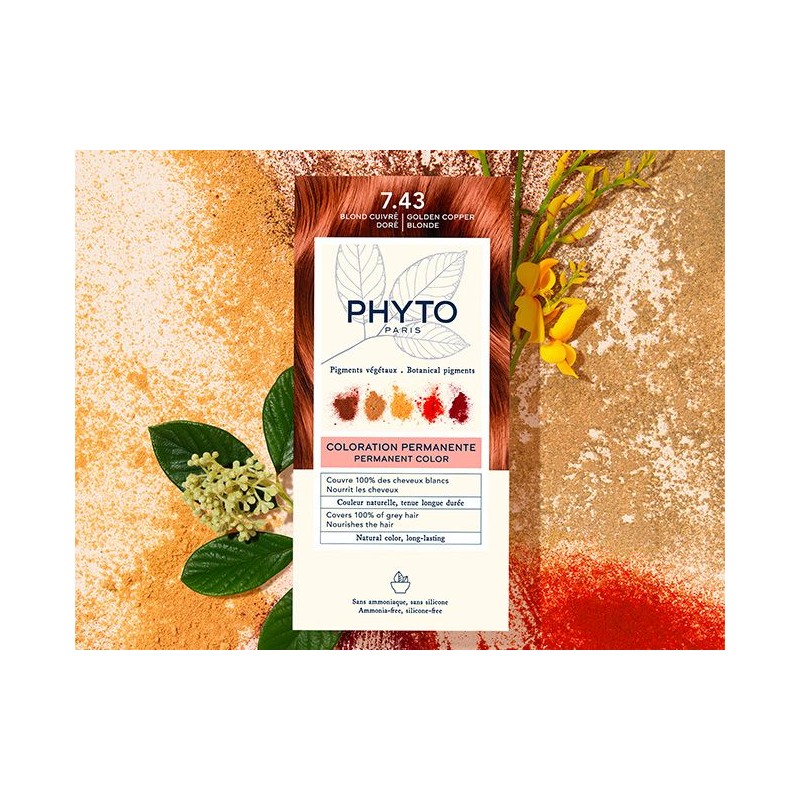 Phyto Color Tinte 7.43 Rubio Dorado Cobrizo ofrece una coloración capilar permanente que combina pigmentos vegetales de alta concentración con tecnología avanzada para un color vibrante, natural y con reflejos luminosos.