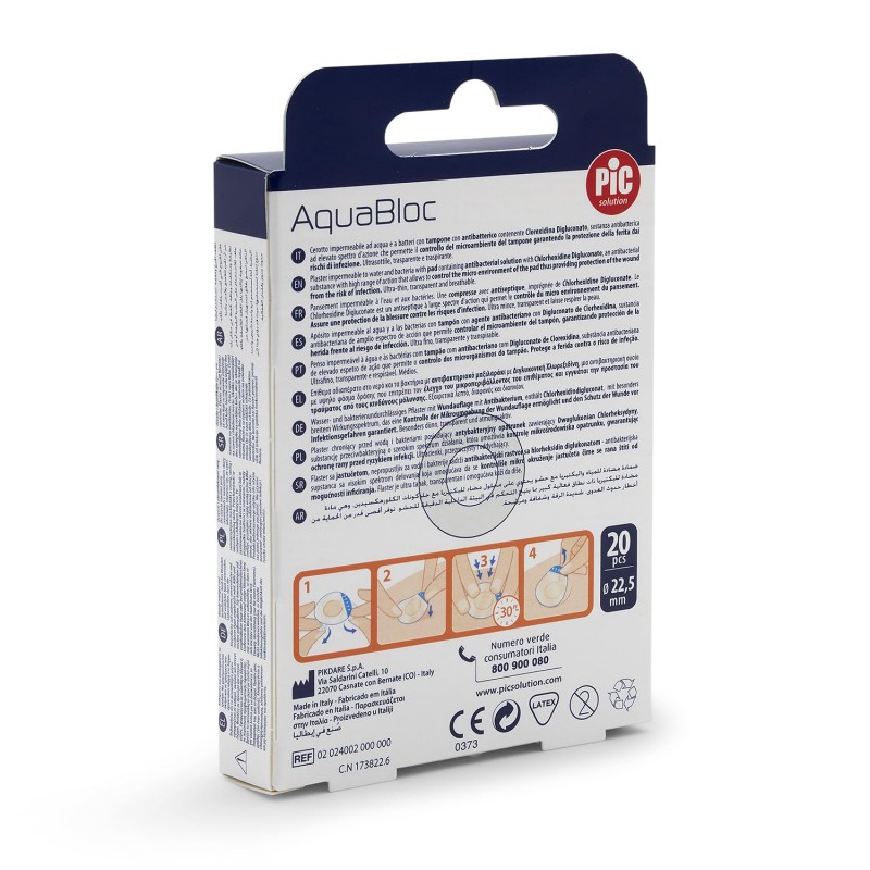 PIC Aquabloc con Bactericida Apósito Adhesivo Redondo (20 uds) es la solución ideal para cubrir pequeñas heridas, cortes o pinchazos. Son apósitos redondos, estériles, resistentes al agua y con gasa central impregnada en clorhexidina, que protegen frente a infecciones sin dejar de transpirar.