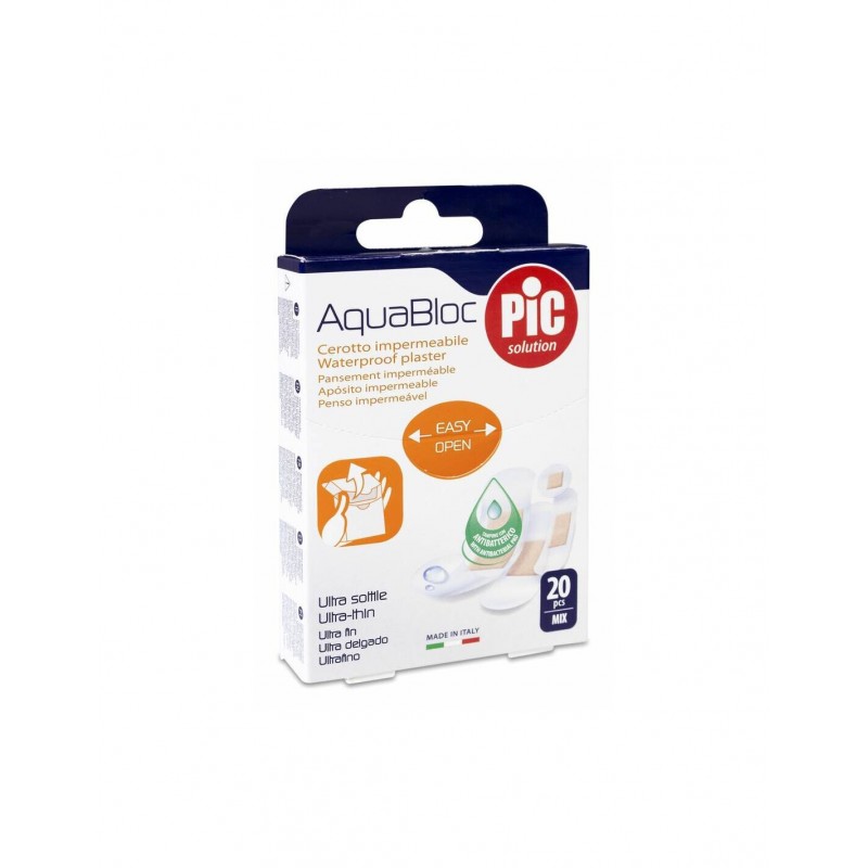 PIC AquaBloc con Bactericida Surtido 20 Apósitos Adhesivos ofrece una protección impermeable, transpirable y antibacteriana para heridas pequeñas. Su diseño ultrafino y discreto garantiza comodidad y seguridad durante todo el día.