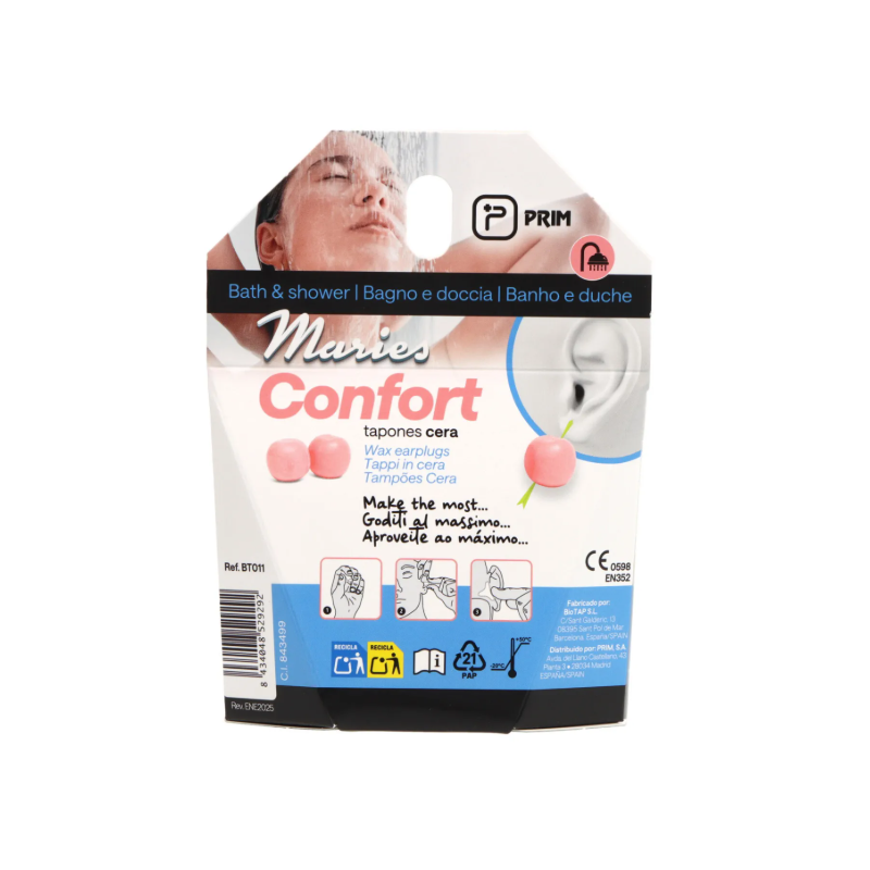 Prim Maries Confort Tapones Oídos de Cera 6 unidades protegen los oídos del ruido y el agua, proporcionando comodidad y un ajuste seguro.