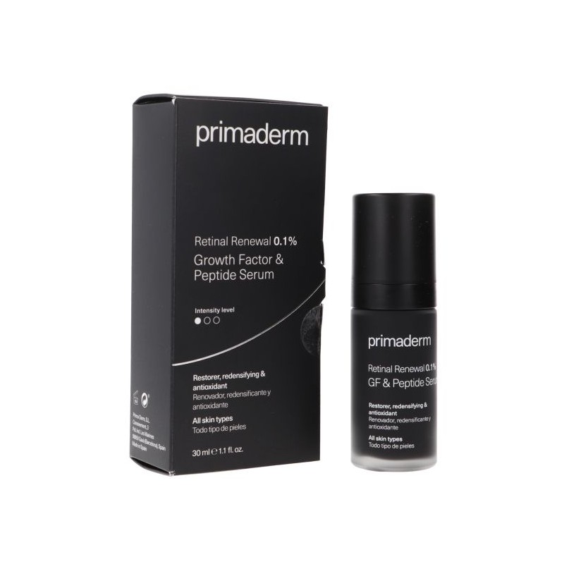Primaderm Retinal Renewal 0.1% 30 ml es un tratamiento facial avanzado con retinaldehído al 0.1%, diseñado para reducir arrugas, mejorar la textura de la piel y aumentar la luminosidad . Su fórmula de alta eficacia estimula la regeneración celular, unifica el tono y combate los signos del envejecimiento.