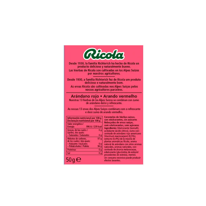 Edulcorante (isomalt), acidulante (ácido cítrico), zumo concentrado de arándano rojo americano (Vaccinum macrocarpon) (0.5%), extracto de la mezcla de hierbas Ricola (0.4%), aroma natural de arándano con otros aromas naturales, aromas naturales, zumo concentrado de Aronio melanocarpa, edulcorante (glucósidos de esteviol), vitamina C, mentol.