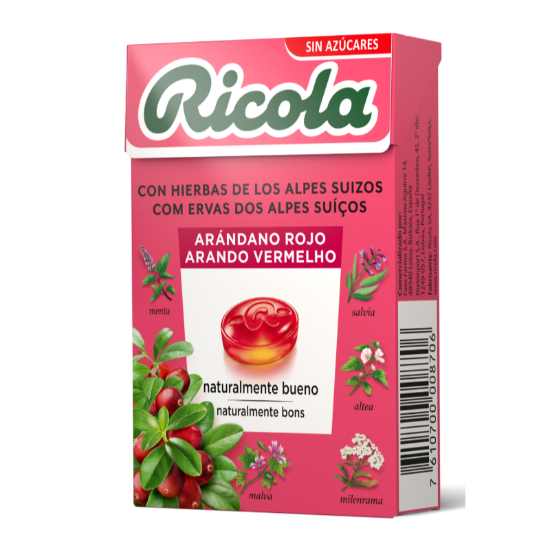 Los Ricola Caramelos Sin Azúcar Sabor Arándano Rojo (50 g) combinan el frescor característico de las hierbas suizas con el toque afrutado del arándano rojo.
