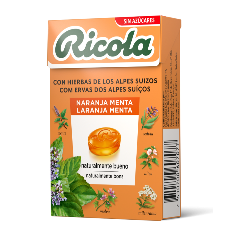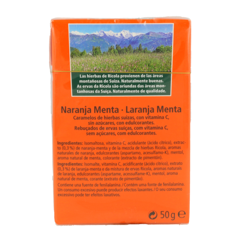 Edulcorante (isomalt), acidulantes (ácido cítrico, ácido málico), zumo de limón concentrado, extractos (0.5%) de naranja-menta, limón-melisa y de la mezcla de hierbas Ricola, aroma natural de naranja, extracto de aceite de paprica, edulcorante (glucósidos de esteviol), vitamina C, aroma natural de cítricos, mentol, aceite esencial de menta, sal.