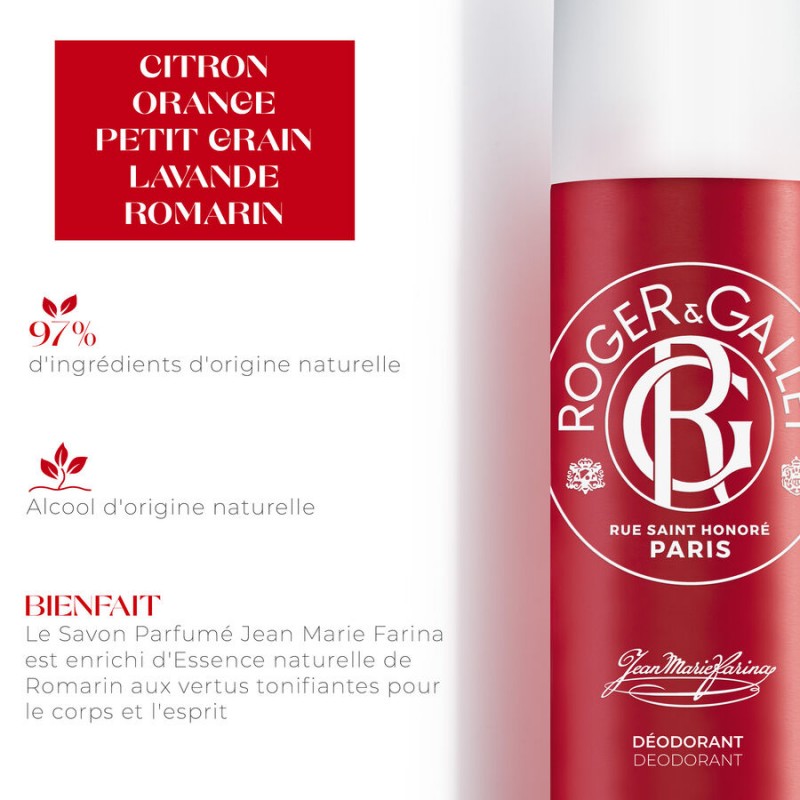 Descubre la combinación perfecta de protección y frescura con Roger & Gallet Desodorante Jean Marie Farina 150 ml. Este desodorante en spray sin sales de aluminio mantiene la piel seca y protegida, al tiempo que deja una agradable fragancia inspirada en la legendaria receta de Jean Marie Farina.